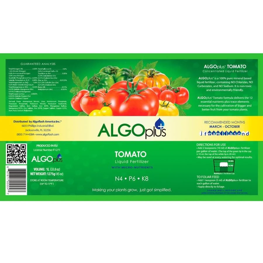 All-Purpose AlgoPlus has an analysis of 6-6-6, Flowering AlgoPlus has an analysis of 4-6-7, and Tomato AlgoPlus has 4-6-8. These numbers represent the percentage of nitrogen, phosphorus, and potassium (N-P-K) contained in this fertilizer. Nitrogen (always the first number) is important to stimulate growth rate and to “green up” the foliage so that it can process nutrients more efficiently. Phosphorus, the middle number, stimulates root growth. And potassium, the last number, stimulates flowering and fruiting.