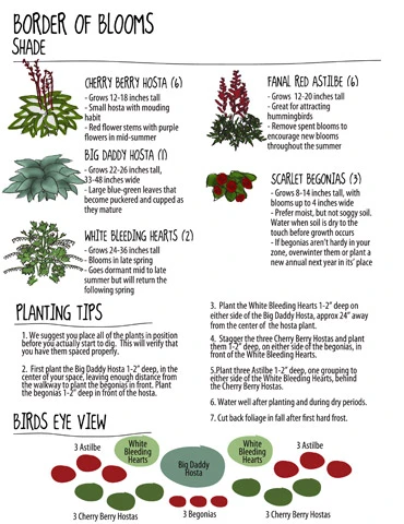 Bring some color and light to your shaded path! The white on the Cherry Berry Hosta and Bleeding Hearts will be a provide a slight ‘glow’ in evening as well. The hostas, astilbe and bleeding hearts will get bushier each year- leaving less room for weeds to creep into your flower bed. Only maintenance is cutting back foliage in fall! If begonias aren’t hardy in your zone, make sure to remove the tubers to save for next year, or try planting an annual in place of the begonias. This collection contains the following: