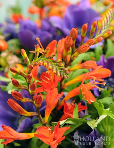 Emily McKenzie Crocosmia (cro-co-s- mia) has bright orange flowers which are highlighted by crimson throats. Crocosmia make great cut flowers and are a nice low maintenance mid summer blooming bulb.