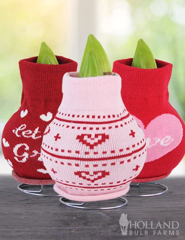 Love is in the Air with beautiful blooming amaryllis bulbs. The amaryllis bulbs in these sweaters are ready to grow and will bloom within a few weeks of receiving them. Hearts and love are the theme of this collection and fully display your love and affection through them. Place the bulbs on any flat surface, no water is required. Amaryllis tolerate low light settings, making them great for offices and rooms with little to natural sunlight.