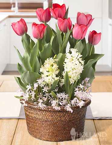 Red tulips, white hyacinths and glory of the snow bulbs are potted and ready to grow in the bulb garden. This potted bulb garden garden comes complete with a 8″ woven pot with plastic lining, soil, & bulbs, for immediate growing.