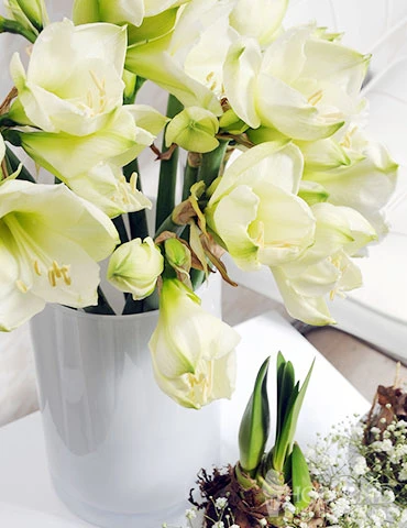Matterhorn Amaryllis have large pure white flowers with tints of green. Maturing at 18″ these bulbs are perfect for indoor blooms! Included in this value pack are 3 Matterhorn Amaryllis size 24/26. Plant all three together in one container, for a bountiful display! Or you may spread them out through several containers to enjoy the white amaryllis blooms in your home in every room! Gardeners in warm climates, hardiness zones 8 and above can plant them outside to enjoy for several seasons!