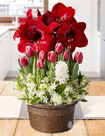 Flowers blooming indoors in the coldest months of a year is truly a Miracle. This Miraculous Gift Potted Bulb Garden will bloom with deep red Miracle Amaryllis, pink Canasta Tulips, fragrant white hyacinths all surrounded by Star of Bethlehem.