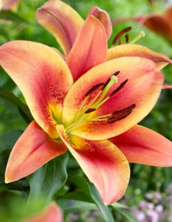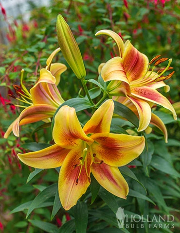 A hybrid lily with outward facing trumpet bloms with yellow and raspberry peach tones. This fragrant lily typically grows 4′ tall, it can grow taller over time if the conditions are right.
