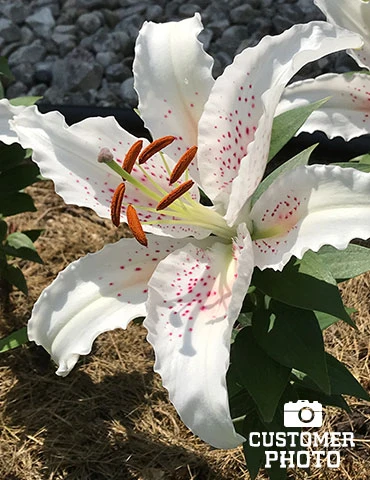 An extremely popular oriental lily, the Muscadet is a true gem in the summer garden. Its gorgeous white petals are all adorned with pink spots throughout the center, making a perfect backdrop for the pronounced pink-orange stamens. Extremely fragrant and excellent for cutflowers, it’s easy to see why this lily is so well-loved!