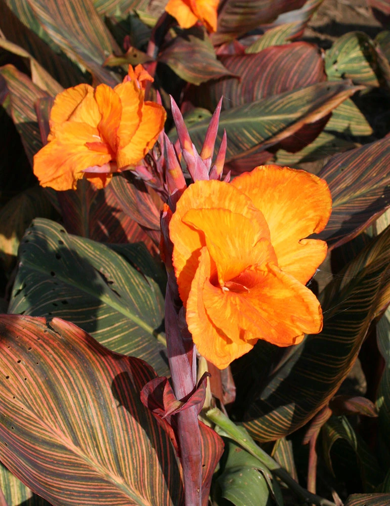 Some like it HOT! This Phasion Canna is the complete package for tropical plants in your summer garden. Large orange blooms will emerge mid-Summer, but that is not even the best part of this canna! Fast growing leaves will emerge a deep red/burgundy color streaked with yellow, green and pink colors to add more color and dimension. Phasion Canna is a tall variety that will grow 5+’ when planted in full sun and provided adequate water.