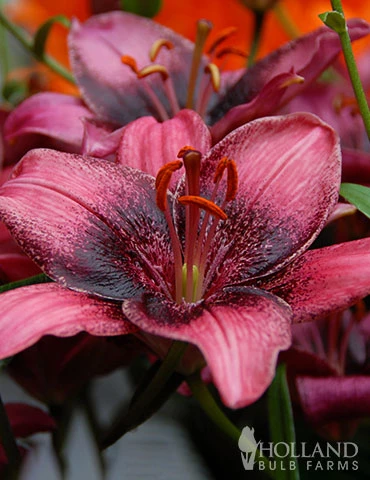One of the most unique Asiatic lilies available, the Purple Eye Asiatic Lily is a beautiful pink lily with a deep purple center. Asiatic lilies have upright facing blooms and bloom mid-summer. Within a few weeks after blooming, Asiatic lilies do go dormant. We recommend planting late summer blooming plants around Asiatic lilies to increase seasonal interest.