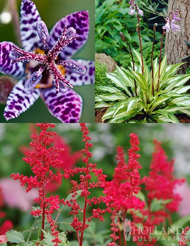 Do you have a little shady garden nook that needs to be filled in? Well, then think no more about it. We have a solution to fill your shady garden corner. This combination of three shade-loving perennials will help fill in the nooks in the garden that don’t get a lot of sun. Adding interest all summer is the Cherry Berry Hosta, with its yellow/green foliage and blooms that have red stems + purple flowers in summer. Mid-summer expect blooms up to 20″ tall from the Fanal Red Astilbe. At the end of summer, the Blue Wonder Toadlily will bloom with intricate purple and white flowers. The best part is all of these perennials tolerate shade to part shade, which is about 3-4 hours of direct sun per day or filtered sun all day. They also all tolerate moist soil, making them a great combination to grow together.