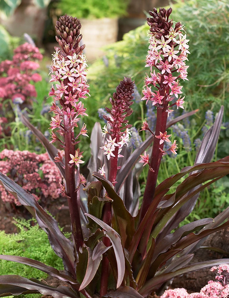Sparkling Burgundy Pineapple Lily is our new favorite for a centerpiece of your container garden. Burdgundy leaves form first followed by a spike or burgundy flowers. Once the flowers dry the seed heads stay intact and create a flower like effect, making the longevity of this bloom months.