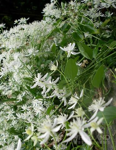 Late blooming clematis with dainty white flowers adorning it late Summer to early Autumn. Plant this vine to grow up a fence trelllis, or arbor and wait for Autumn for it’s sweetly scented white blooms!