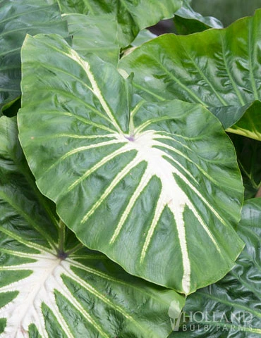White Lava Elephant Ear is absolutely beautiful! The glossy green leaves have white veining that will become more pronounced as the season progresses! Each leaf also has a bright purple spot at the leaf base and is held up by glossy, purple stems! The White Lava Elephant Ear is a perfect variety to grow in a pot or a backdrop to your summer garden bed. In zones 4-7, plant in a container and take it indoors during the winter months to enjoy year after year!