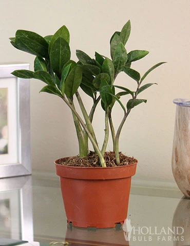 ZZ Plants are notorious for being one of the easiest to grow houseplants requiring very little maintenance! This upright plant has shiny, bright green leaves that darken as they mature. ZZ Plants are known for being able to grow in any type of lighting, including very low light making this houseplant perfect for an office! They only require water every 2-3 weeks and do prefer to dry out in between watering. Although they are versatile, make sure to keep your ZZ Plant away from your pets!