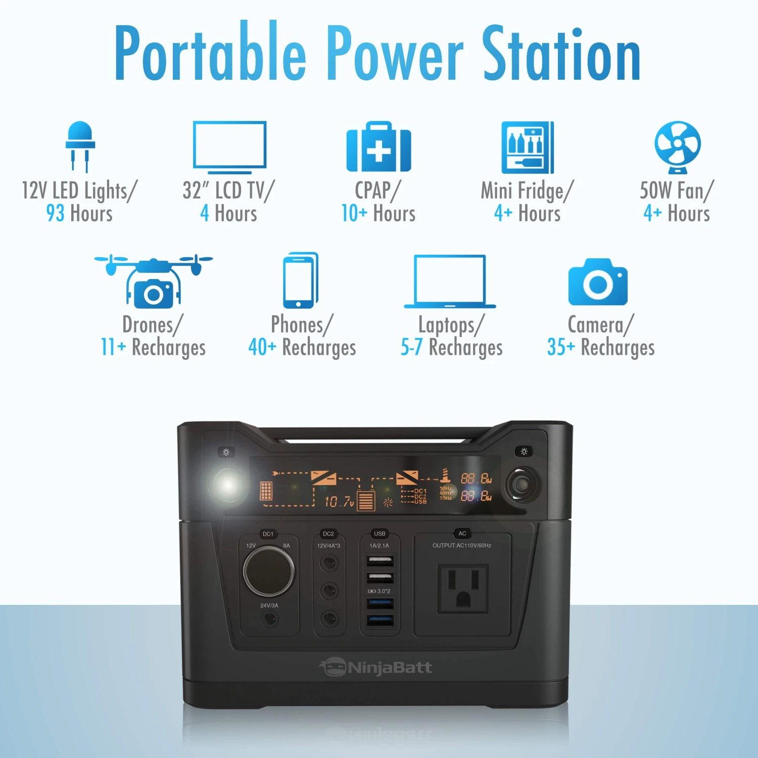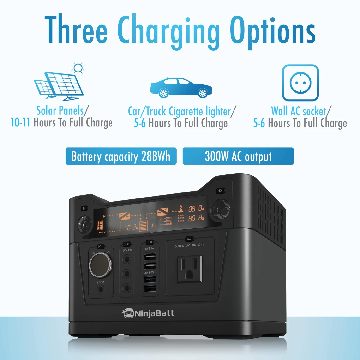 Ninjabatt 300W portable power station. 280WH Lithium power pack powerful enough to charge smartphones (2000mah) 25 times, laptops (56wh) 4-5 times, mini car refrigerator (75W) about 3-5 hours or other small appliances, lights, and more