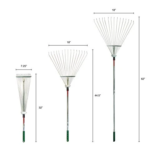 TELESCOPIC RAKE β This excellent all purpose rake adjusts in Three ways. The fan head adjusts with an easy movement and the take care of telescopes quick easily. It telescopes from 32 inches to 61 inches for all of your raking needs. Also, the tough steel tines adjust from 7.5 inches to 21.5 inches wide.
