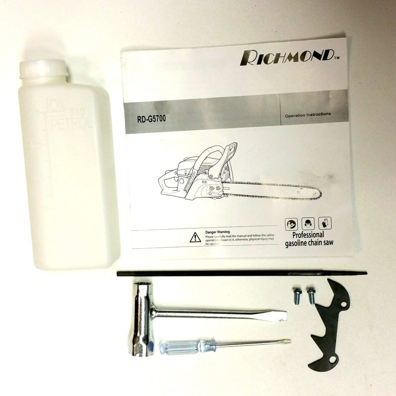 RICHMOND 57 cc 20″ bar gasoline chainsaw; Engine: Air cooling; single cylinder, two stroke gasoline engine; Most Power: 3.4 HP; Most torque: 16 Nm; Displacement: 57 cc; Idling speed: 2800 ~ 3200 rpm; Most speed: 10,500 rpm; Ignition: CDI; Chain oiler: auto; Starter: Simple Get started hand recoil; Air filter out: Fiber washer-friendly; Anti kickback; Anti vibration take care of; Bar/chain: 20″; ; Fuel tank capability: 500 ml; Fuel: Gasoline/2-cycle with oil Blending ratio 25:1; Oil tank capability: 240 ml; Chain Pitch: 0.325″; Internet weight: 20 Lb; Package dimensions: 20″x10:x12″; Assembly required. PACKAGE INCLUDES Emblem New RICHMOND RD-G5700 57cc 20″bar gasoline chainsaw; 20″ bar/chain; Bag of hardware/tools ; Blending bottle; Owner’s manual. Note: COLOR MAY BE DIFFERENT.